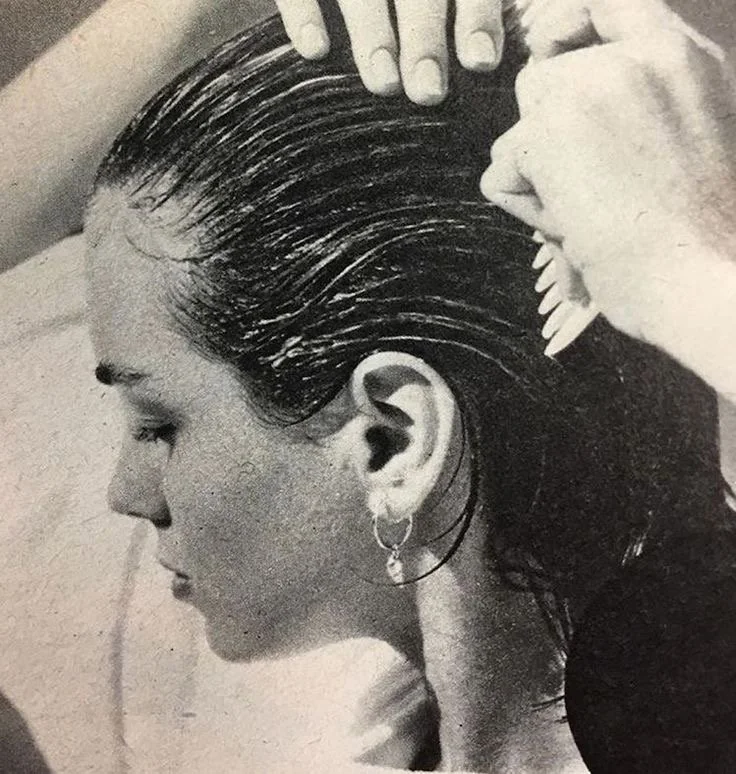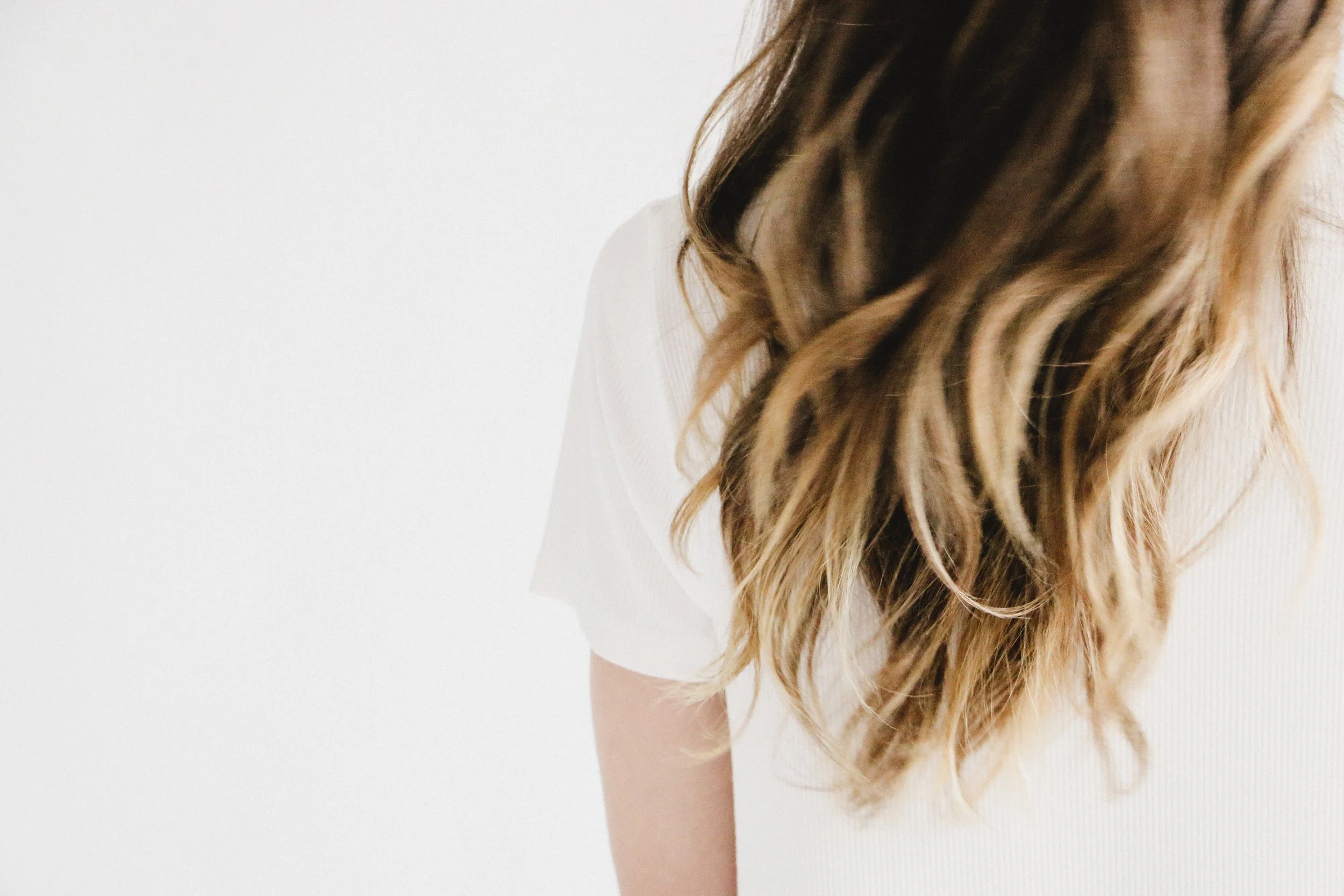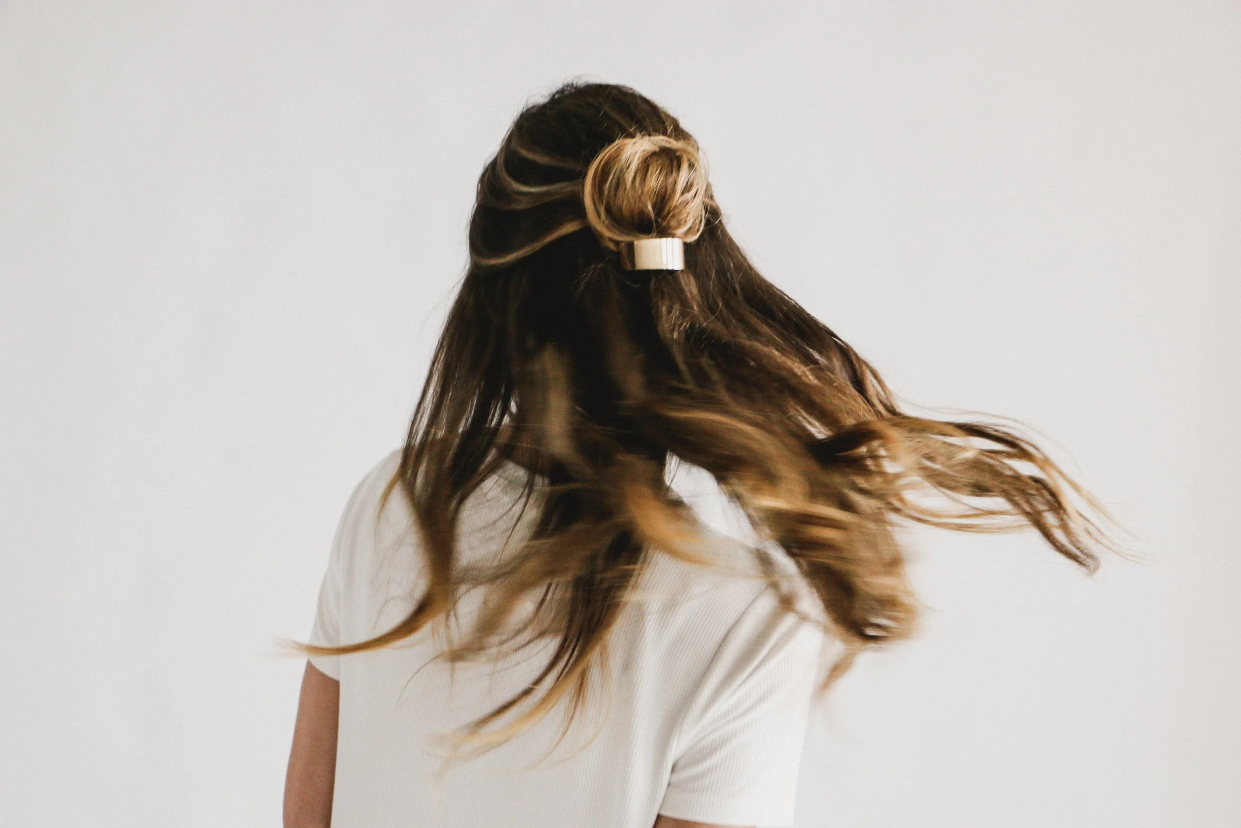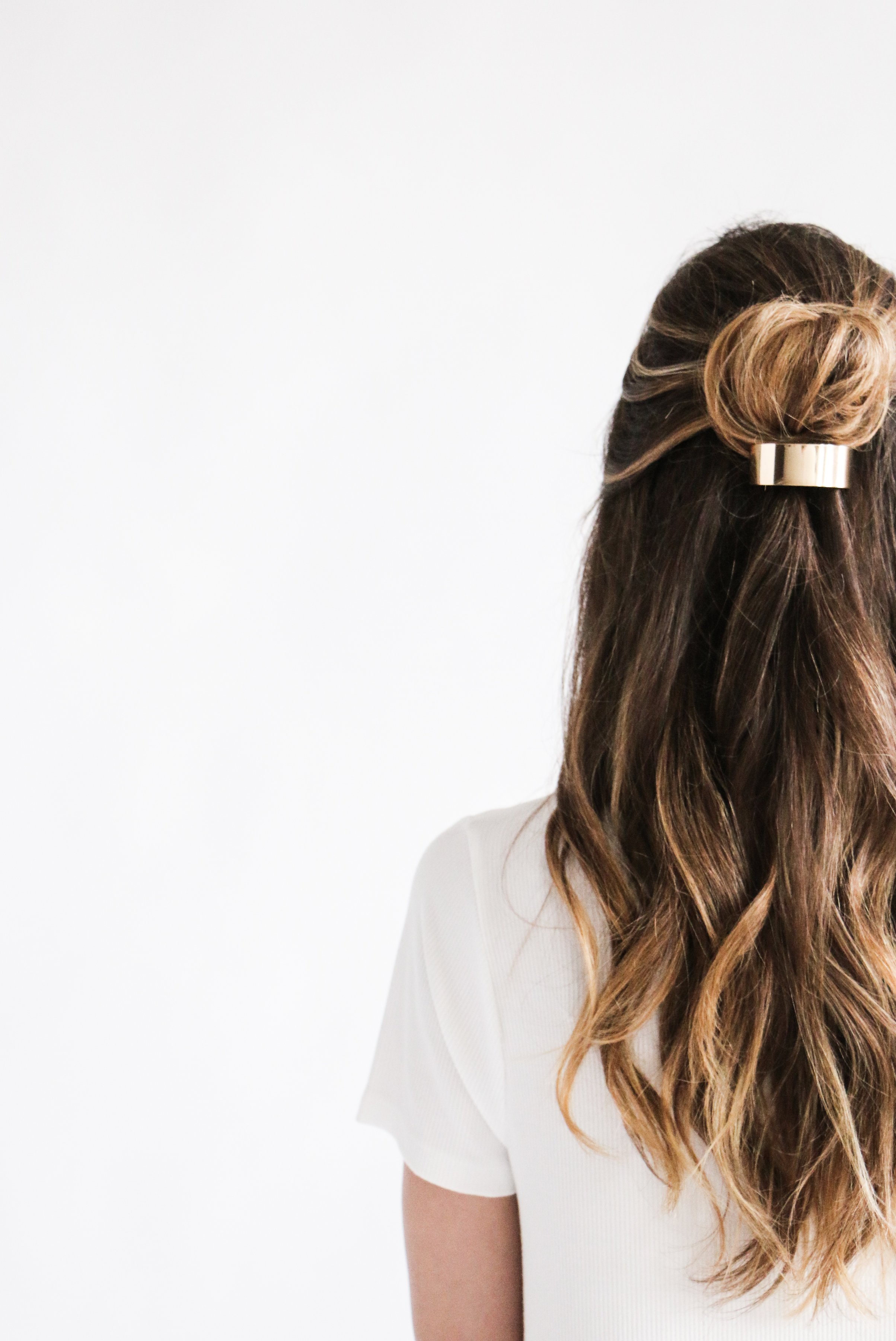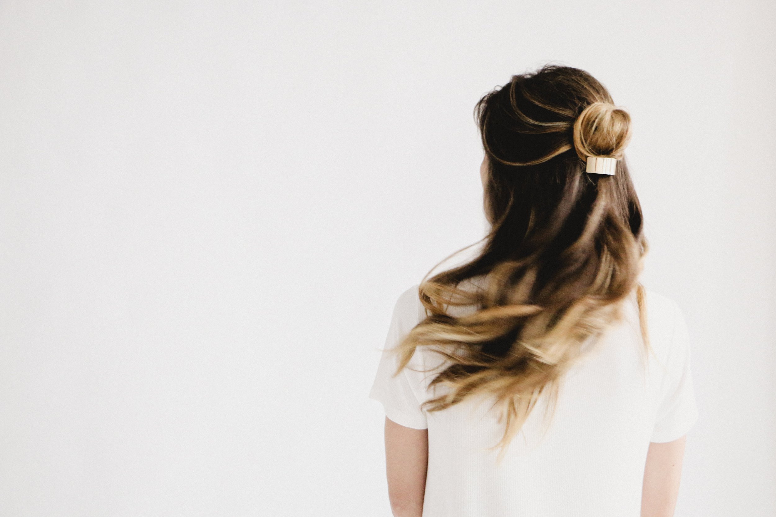 Back view of a woman with long, wavy brown hair secured partially with a hair clip, wearing a white shirt, against a plain white background.
