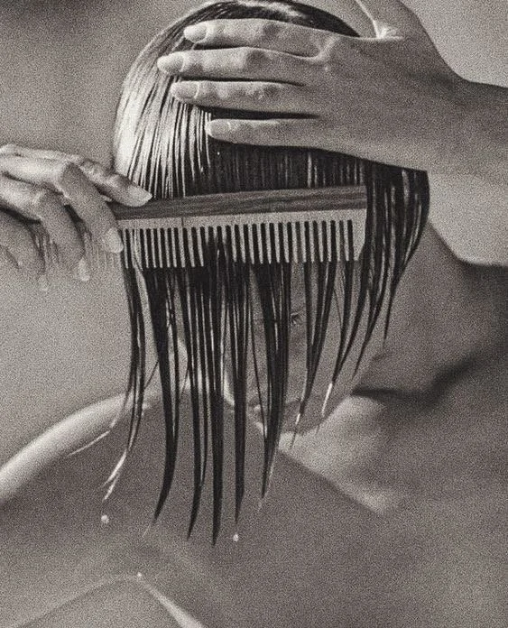 A woman with long brown hair, partially pinned back with a white hair clip, is flipping her hair. She is wearing a white shirt against a plain background.